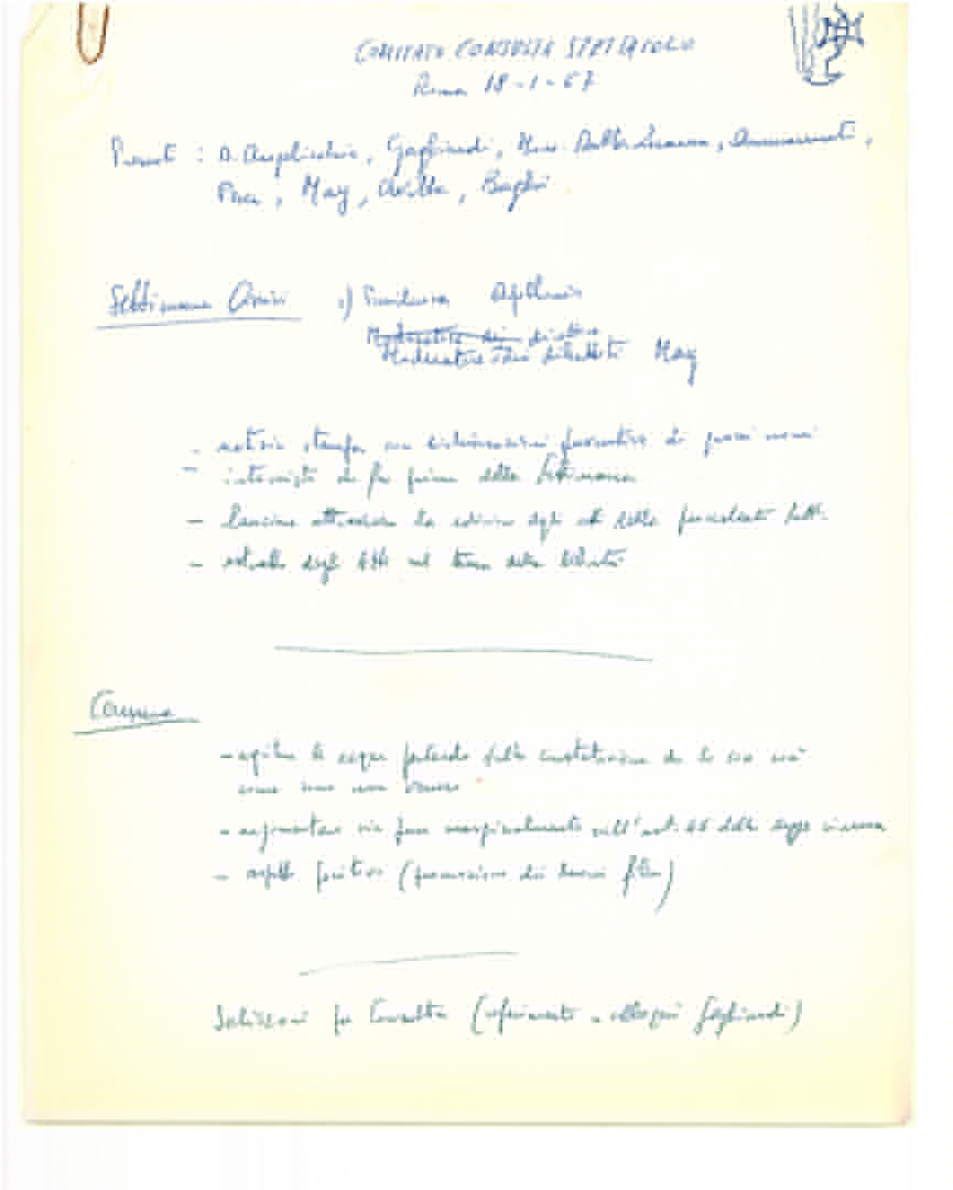 Prospetto dei gruppi di lavoro. Dattiloscritto, con appunto manoscritto