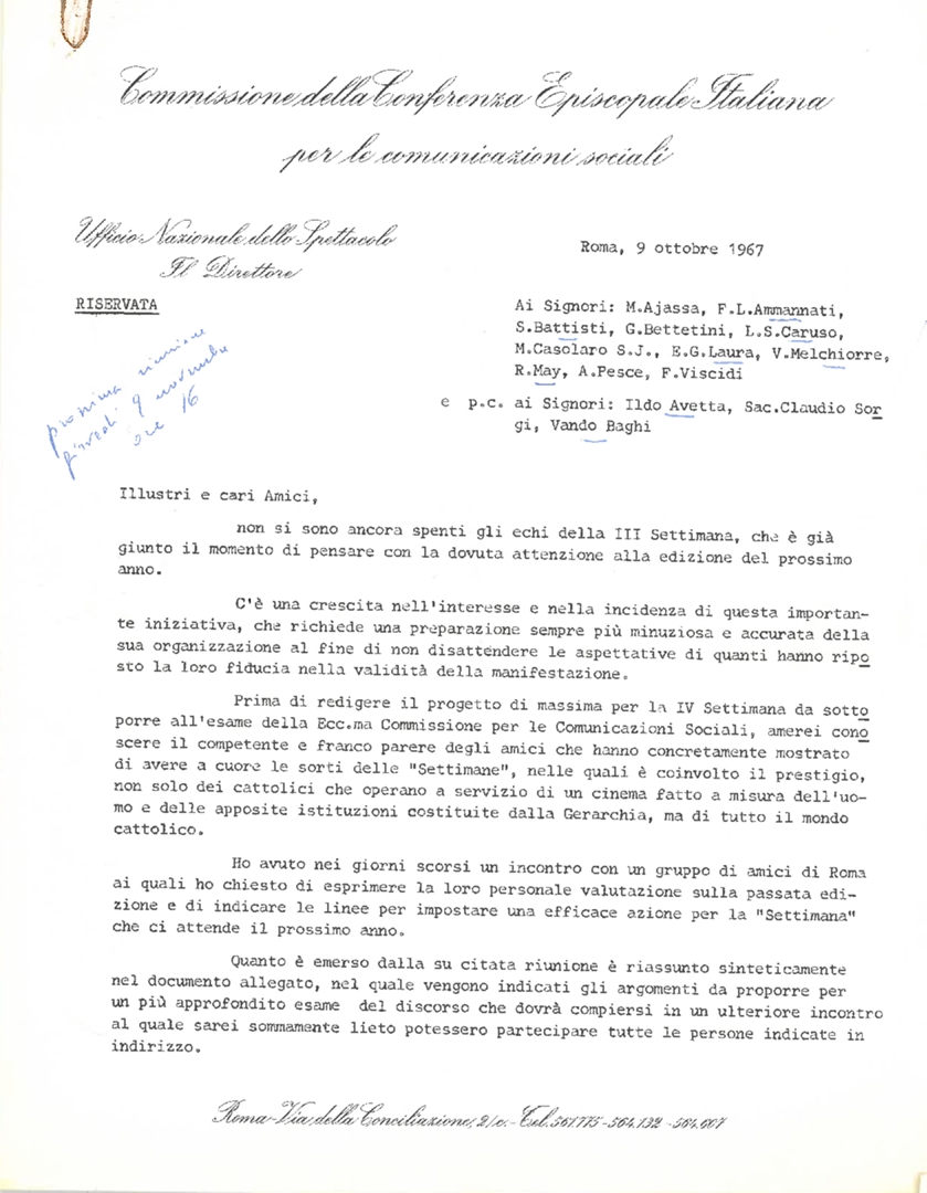 Con lettera di trasmissione di don Francesco Angelicchio, direttore dell'Ufficio Nazionale dello Spettacolo della Commissione della Conferenza Episcopale Italiana per le comunicazioni sociali, a destinatari diversi. Dattiloscritto