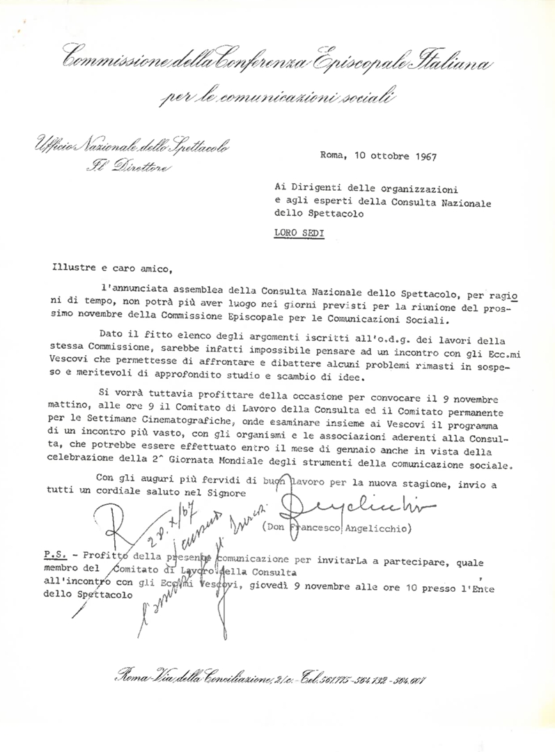 Lettera di don Francesco Angelicchio, direttore dell'Ufficio Nazionale dello Spettacolo della Commissione della Conferenza Episcopale Italiana per le comunicazioni sociali, ai dirigenti delle organizzazioni e agli esperti della Consulta nazionale dello spettacolo