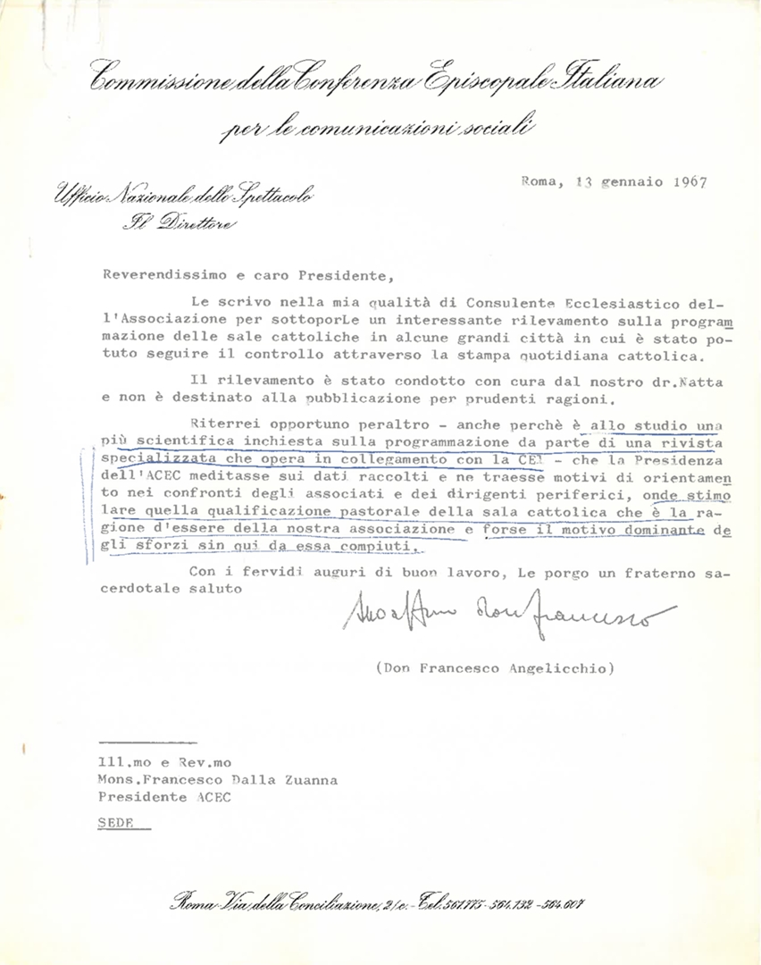 Lettera di don Francesco Angelicchio, direttore dell'Ufficio Nazionale dello Spettacolo della Commissione della Conferenza Episcopale Italiana per le comunicazioni sociali, a mons. Francesco Dalla Zuanna, presidente dell'ACEC