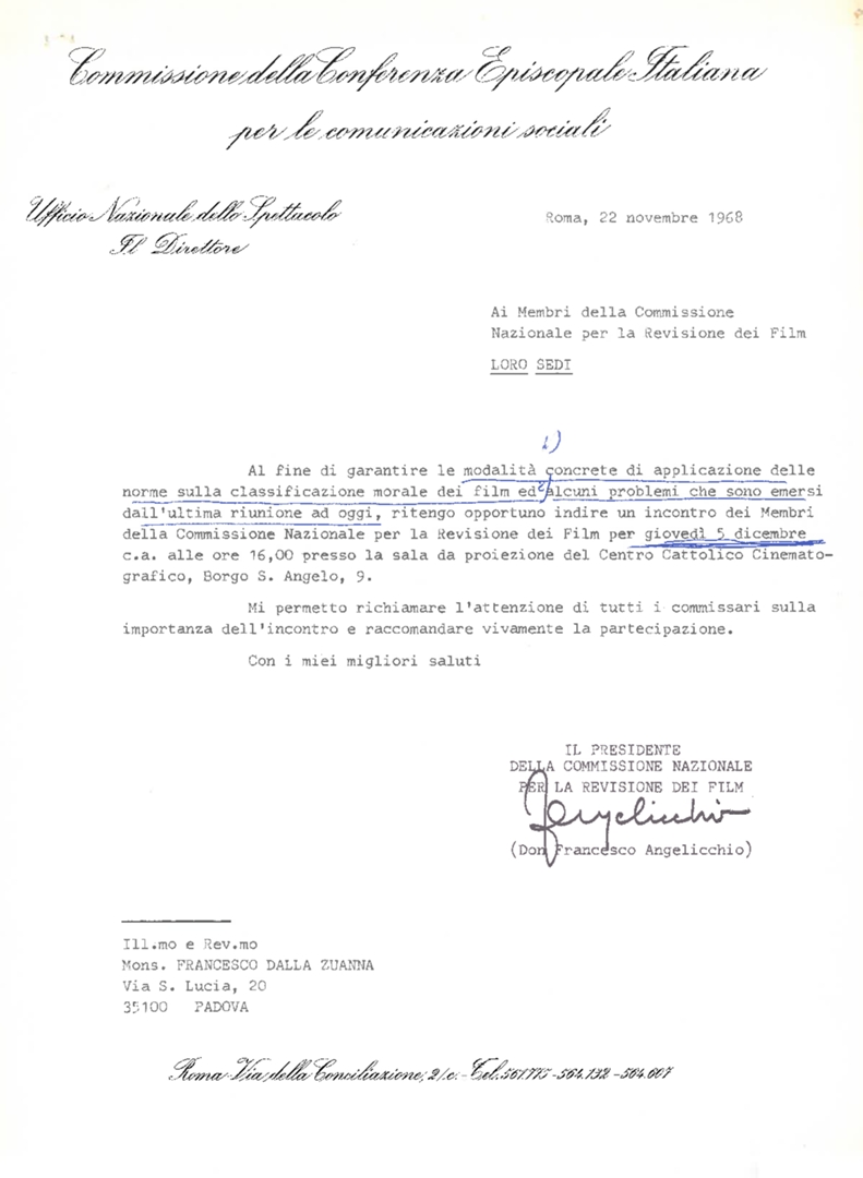 Lettera di don Francesco Angelicchio, direttore dell'Ufficio Nazionale dello Spettacolo della Commissione della Conferenza Episcopale Italiana per le comunicazioni sociali, ai componenti la Commissione nazionale di revisione dei film