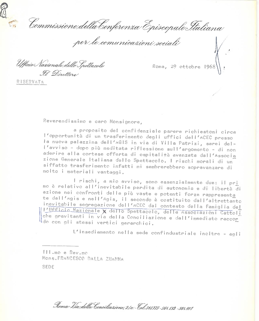 Don Francesco Angelicchio scrive a mons. Francesco Dalla Zuanna sull'ipotesi di un trasferimento della sede dell'ACEC nella palazzina dell'AGIS. Dattiloscritto