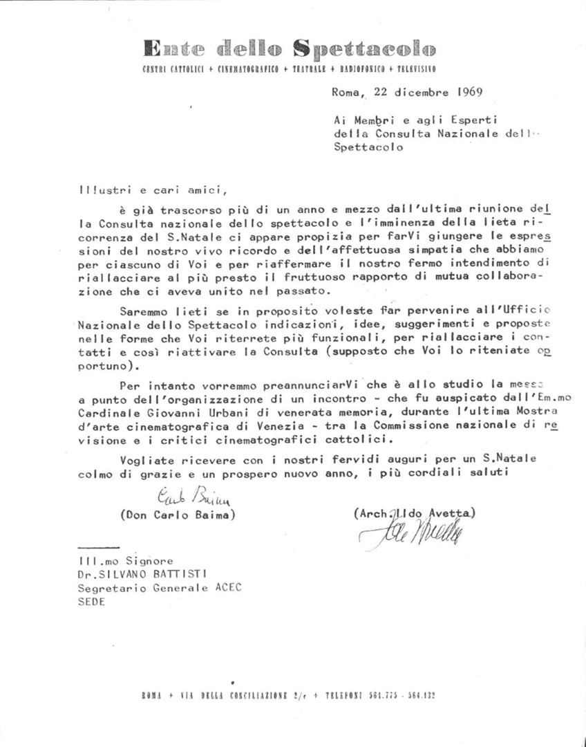 Lettera a firma di Ildo Avetta, dell'Ufficio nazionale dello spettacolo, e di mons. Carlo Baima, consulente ecclesiastico EdS e direttore dell'Ufficio nazionale dello spettacolo, a Silvano Battisti, segretario generale dell'ACEC