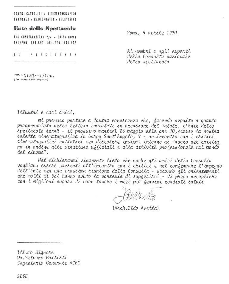 Lettera di Ildo Avetta, dell'Ufficio nazionale dello spettacolo, a Silvano Battisti, segretario generale dell'ACEC