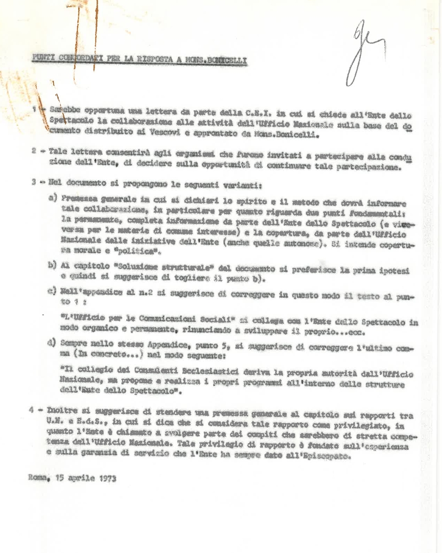 In allegato il documento sulla costituzione del nuovo Ufficio nazionale dello spettacolo. Dattiloscritto