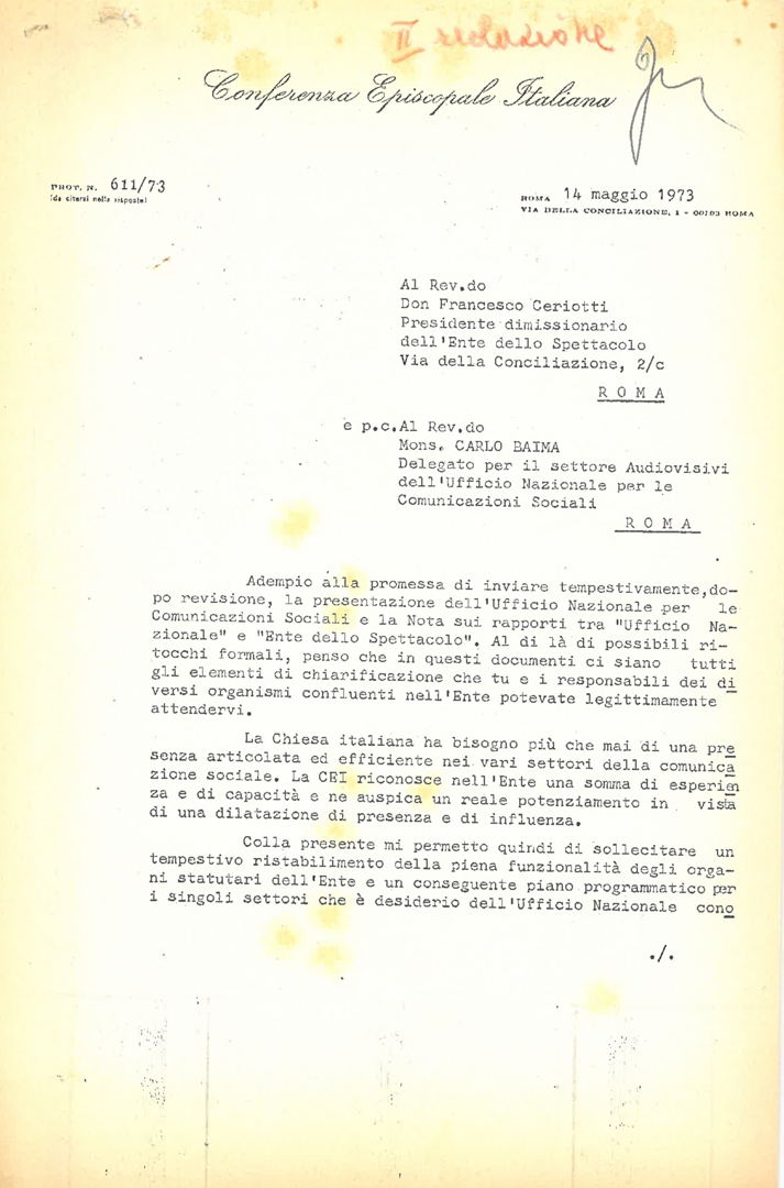 Con lettera di trasmissione di mons. Gaetano Bonicelli, segretario aggiunto e direttore ad interim dell'Ufficio nazionale per le comunicazioni sociali, a don Francesco Ceriotti, presidente dimissionario dell'Ente dello spettacolo, e a mons. Carlo Baima, delegato per il settore audiovisivi dell'Ufficio nazionale per le comunicazioni sociali. Dattiloscritto