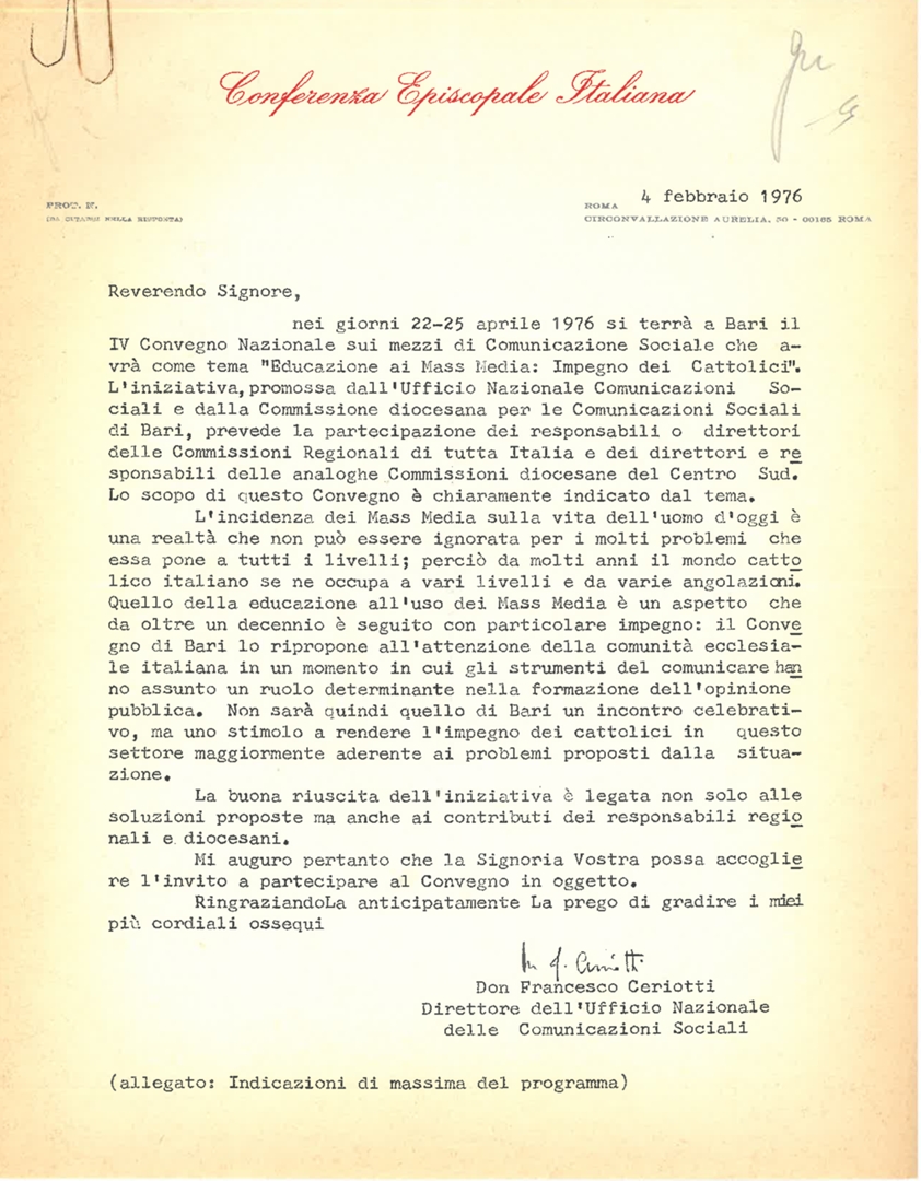 Con lettera di trasmissione di don Francesco Ceriotti, direttore dell'Ufficio nazionale delle comunicazioni sociali, a mons. Luigi Pignatiello, presidente dell'ACEC. Dattiloscritto