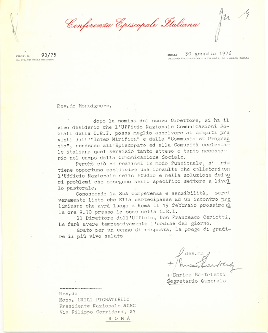 Mons. Enrico Bartoletti invita mons. Luigi Pignatiello ad un incontro per discutere della costituzione di una Consulta destinata a collaborare con l'Ufficio nazionale delle comunicazioni sociali. Dattiloscritto
