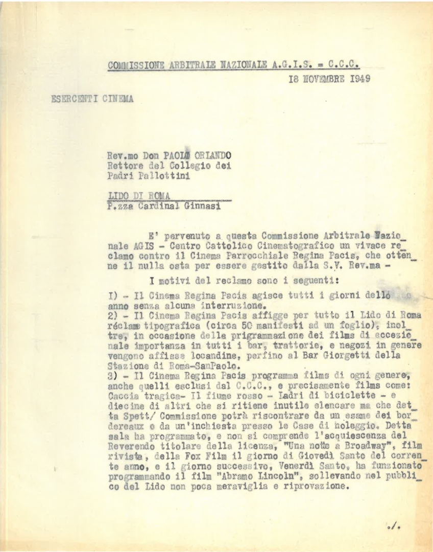 L'avv. Carlo Latini scrive a don Paolo Orlando in merito al reclamo contro il cinema parrocchiale Regina Pacis del Lido di Roma. Dattiloscritto
