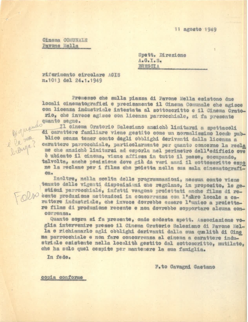La direzione del cinema comunale di Pavone del Mella segnala l'irregolare attività del locale cinema oratorio salesiano. Dattiloscritto