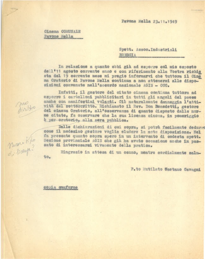 Lettera della direzione del cinema comunale di Pavone del Mella in provincia di Brescia, a firma di Gaetano Cavagni, all'Associazione degli industriali di Brescia