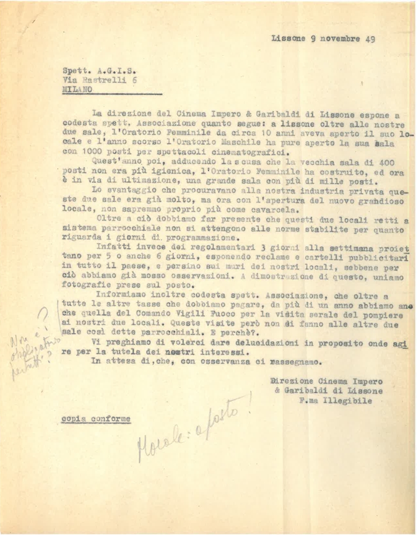La direzione del cinema Impero & Garibaldi di Lissone segnala l'irregolare attività del locale cinema dell'oratorio femminile. Dattiloscritto