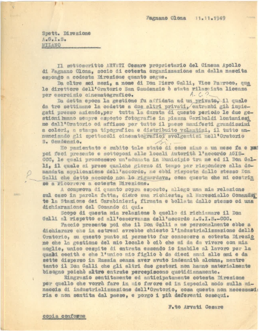Lettera della direzione del cinema Apollo di Fagnano Clona in provincia di Varese, a firma di Cesare Arvati, all'Associazione generale italiana dello spettacolo - AGIS