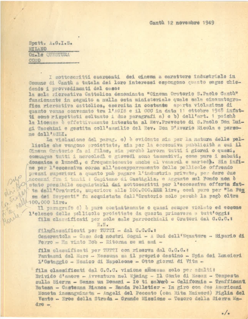 La direzione del cinema comunale di Cantù segnala l'irregolare attività del locale cinema oratorio San Paolo Cantù. Dattiloscritto