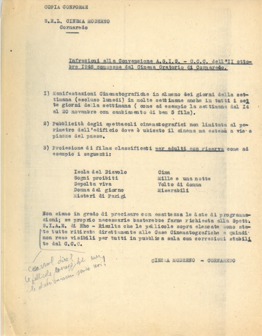 La direzione dei cinema Moderno di Cornaredo segnala l'irregolare attività del locale cinema oratorio. Dattiloscritto