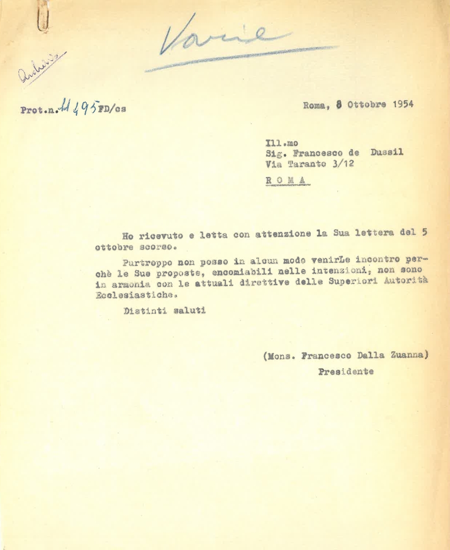 Lettera di risposta di mons. Francesco Dalla Zuanna, presidente dell'ACEC, a Francesco de Dussil