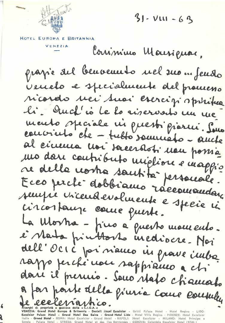Mons. Francesco Angelicchio scrive a mons. Francesco Dalla Zuanna per aggiornamenti su incontri, nomine e altre vicende del settore cinematografico cattolico. Manoscritto