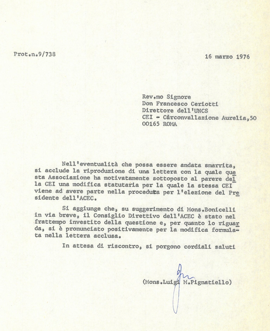 Lettera di Luigi Maverna, segretario generale della Conferenza episcopale italiana - CEI, a mons. Luigi Pignatiello, presidente dell'ACEC
