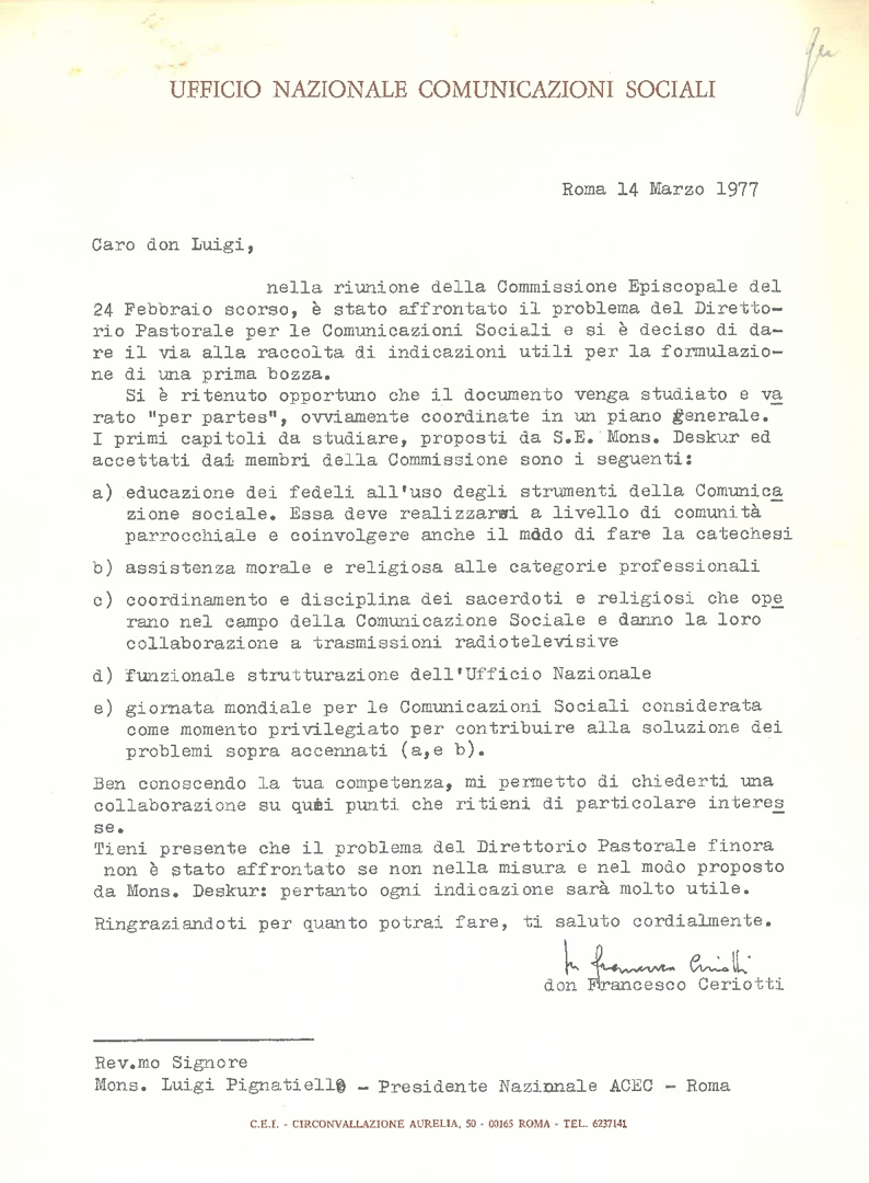 Don Francesco Ceriotti scrive a mons. Luigi Pignatiello in merito al Direttorio pastorale per le comunicazioni sociali e chiede un parere per la formulazione di una prima bozza costitutiva. Dattiloscritto