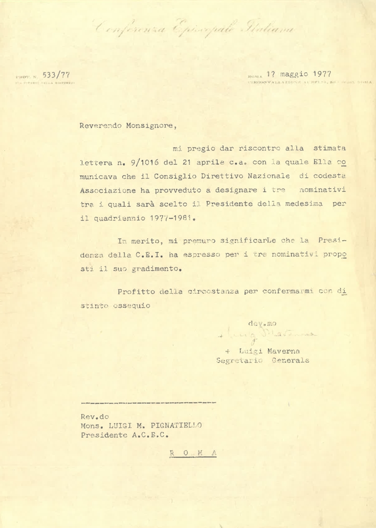 Lettera di Luigi Maverna, segretario generale della Conferenza episcopale italiana - CEI, a mons. Luigi Pignatiello, presidente dell'ACEC