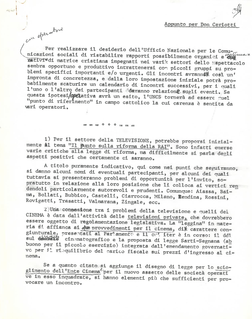 Proposta di incontri di studio per l'esame dei problemi dell'attività cattolica in campo cinematografico. Dattiloscritto