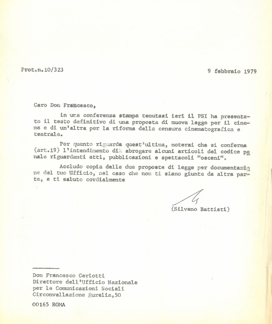 Silvano Battisti scrive a don Francesco Ceriotti in merito alla proposta di una nuova legge per il cinema e di un'altra per la riforma della censura cinematografica e teatrale. Dattiloscritto