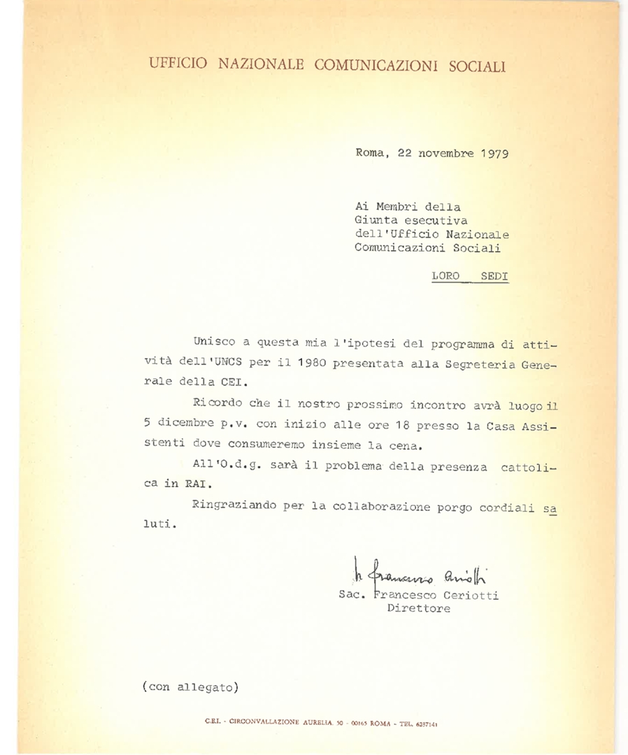 Lettera di don Francesco Ceriotti, direttore dell'Ufficio nazionale delle comunicazioni sociali - UNCS, a destinatario non indicato