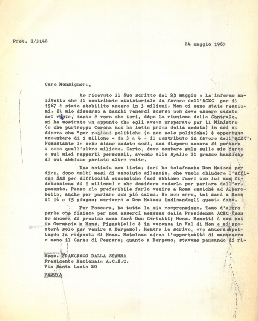 Silvano Battisti riferisce a mons. Francesco Dalla Zuanna sui contributi ministeriali in favore dell'ACEC e lo informa sulla situazione di alcune delegazioni regionali. Dattiloscritto
