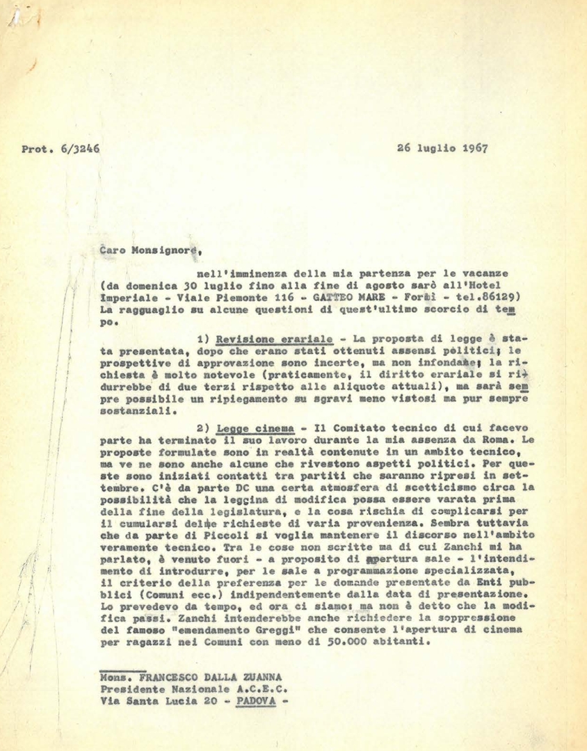 Silvano Battisti invia a mons. Francesco Dalla Zuanna aggiornamenti su revisione erariale, legge cinema, sale e programmazione specializzata, convegno di Bergamo, contributo ministeriale, situazioni locale e contributi associativi. Dattiloscritto