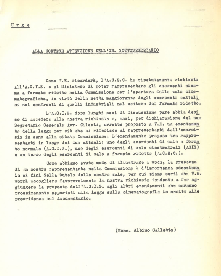 Mons. Albino Galletto scrive all'on. Giulio Andreotti a proposito dell'inserimento dell'ACEC tra i membri della Commissione per l'apertura delle sale cinematografiche. Dattiloscritto