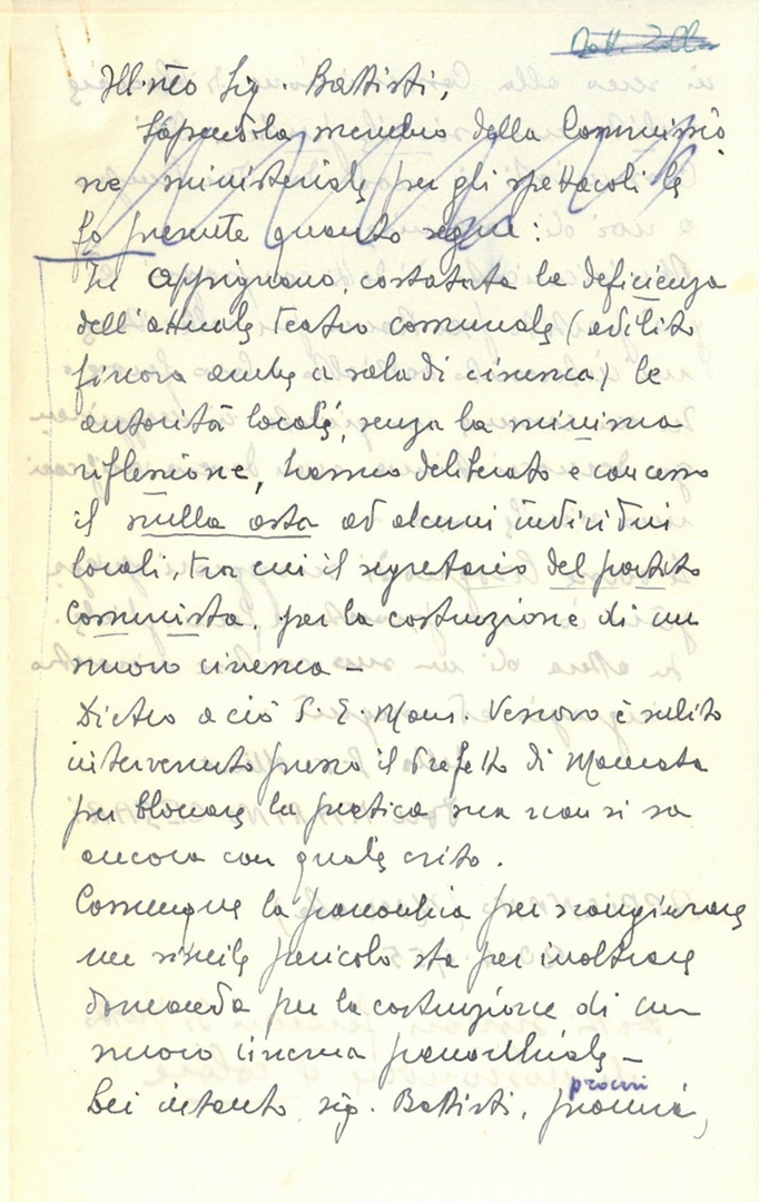 Don Marino Cesari segnala a Silvano Battisti la situazione delle locali sale cinematografiche e teatrali. Manoscritto