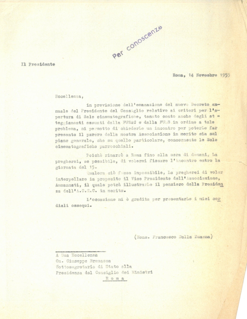 Mons. Francesco Dalla Zuanna scrive all'on. Giuseppe Brusasca in merito ai criteri per l'apertura di sale cinematografiche parrocchiali. Dattiloscritto