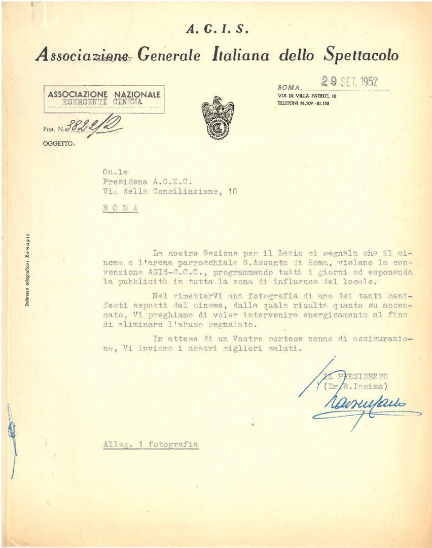 Lettera di Edmondo Incisa di Camerana, presidente dell'Associazione generale italiana dello spettacolo - AGIS, a mons. Francesco Dalla Zuanna, presidente dell'ACEC