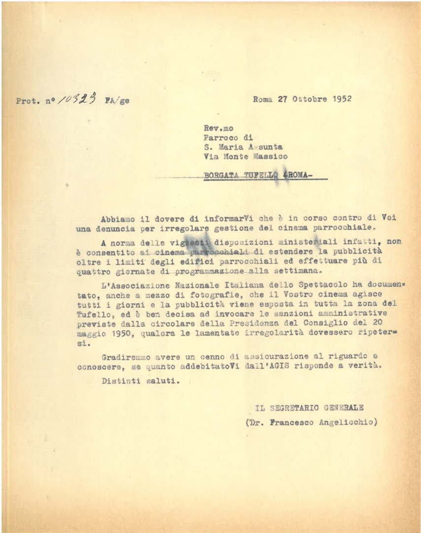 Don Francesco Angelicchio segnala al parroco la denuncia per l'irregolare gestione del cinema parrocchiale. Dattiloscritto