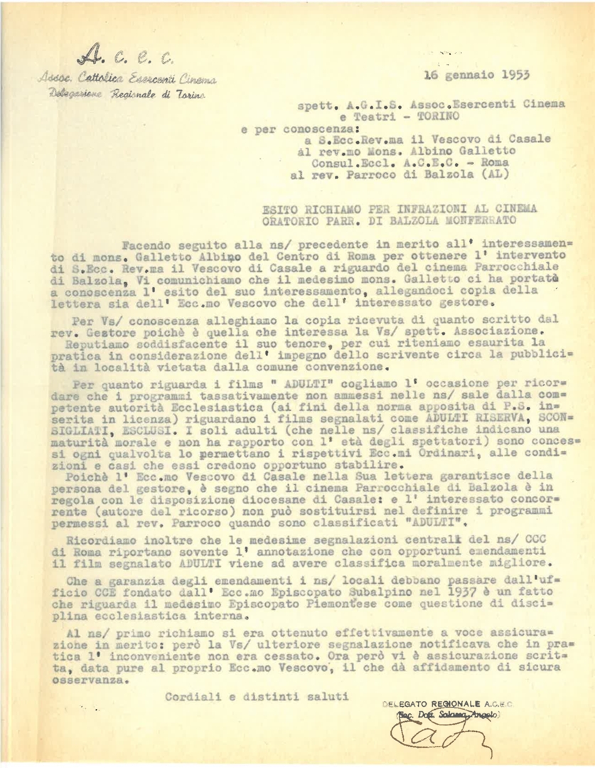 Don Angelo Salassa in merito all'esito del richiamo per irregolare attività al cinema oratorio parrocchiale di Balzola Monferrato in provincia di Alessandria. Dattiloscritto