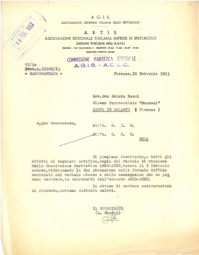 Con lettera di trasmissione del segretario A. Ghezzi a don Solaro Bucci del cinema parrocchiale Manzoni di Greve in Chianti in provincia di Firenze nella quale si segnala la denuncia per l'irregolare attività della sua sala cinematografica. Dattiloscritto