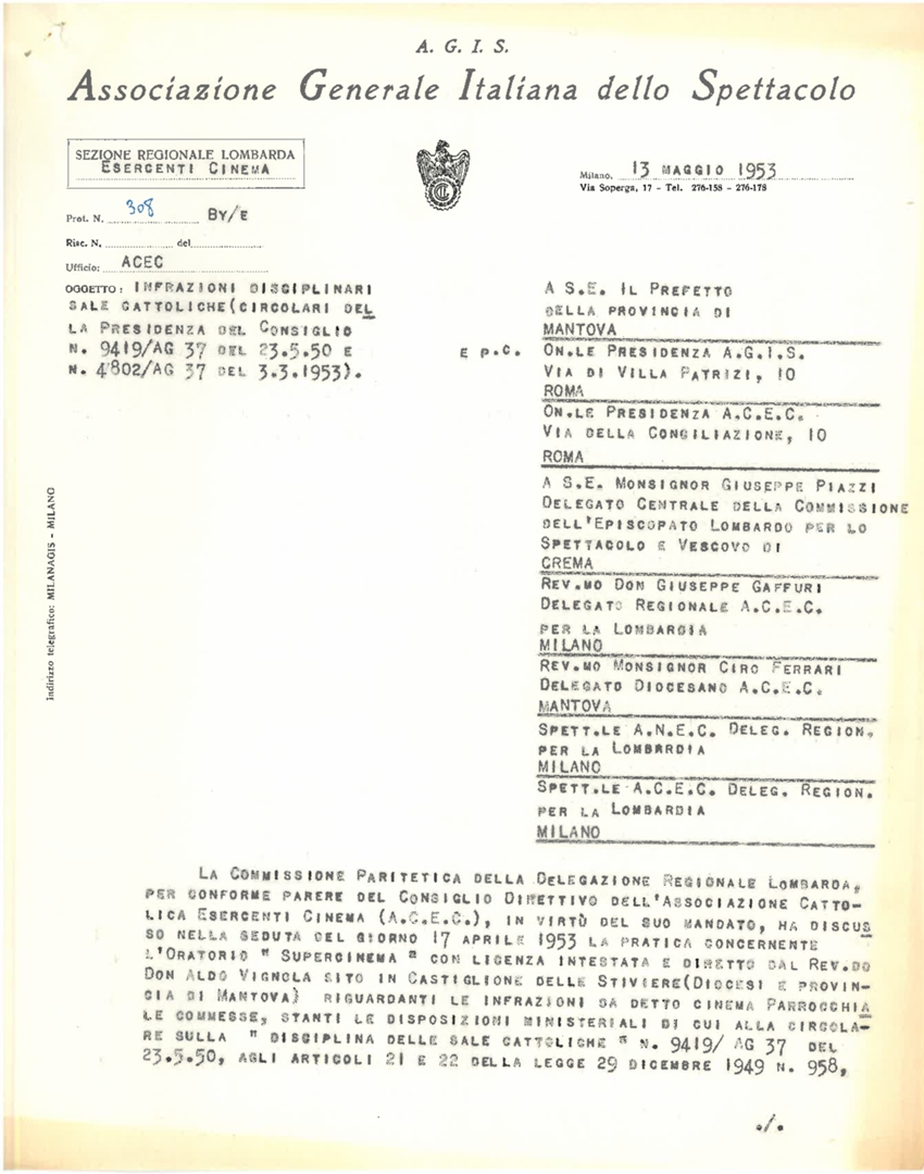 Michele Suvini e don Giuseppe Gaffuri segnalano alla Prefettura di Mantova infrazioni disciplinari delle sale cinematografiche cattoliche, in particolare del cinema parrocchiale di Castiglione delle Stiviere in provincia di Mantova. Dattiloscritto