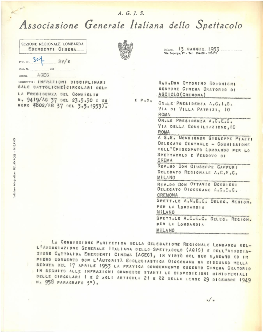Lettera di Michele Suvini, presidente dell'Associazione Lombarda Esercenti Cinema e Teatri, e di don Giuseppe Gaffuri, delegato regionale ACEC della Lombardia, a don Ottorino Bocchieri, gestore del cinema oratorio di Agoiolo in provincia di Cremona