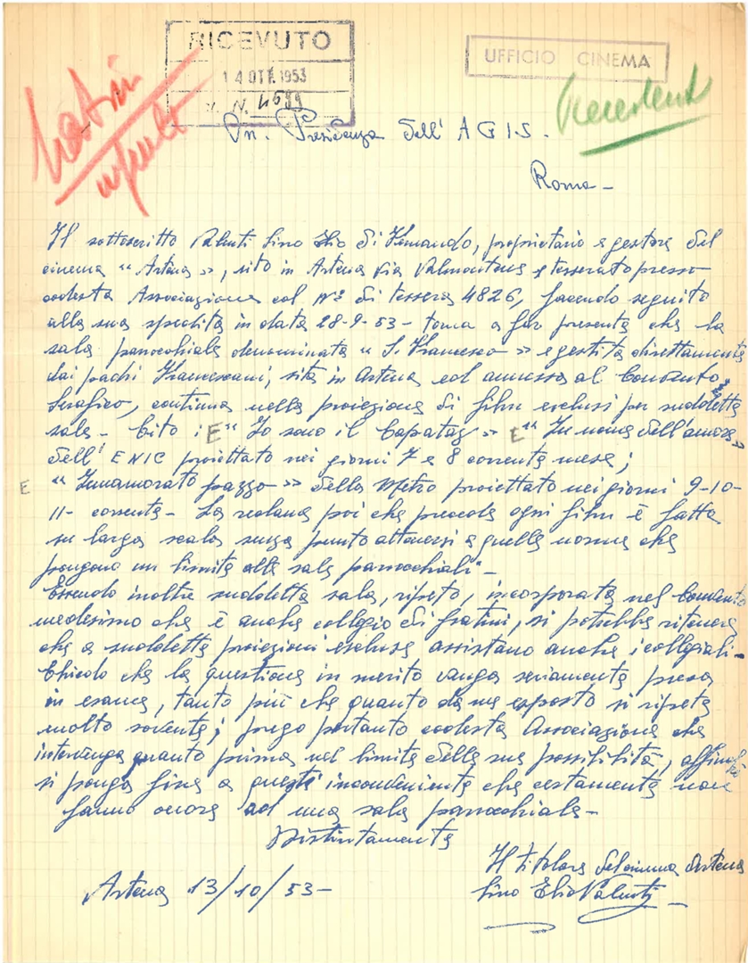 La direzione del cinema di Artena segnala l'irregolare attività del locale cinema parrocchiale San Francesco. Manoscritto