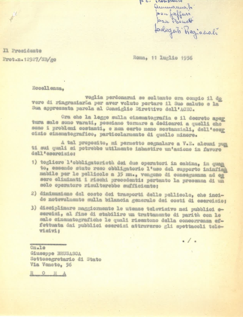 Lettera di mons. Francesco Dalla Zuanna, presidente dell'ACEC, all'on. Giuseppe Brusasca, sottosegretario di Stato alla Presidenza del consiglio dei ministri, Direzione generale dello spettacolo