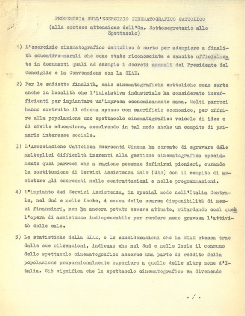 "Promemoria sull'esercizio cinematografico cattolico (alla cortese attenzione dell'onorevole sottosegretario allo spettacolo)"