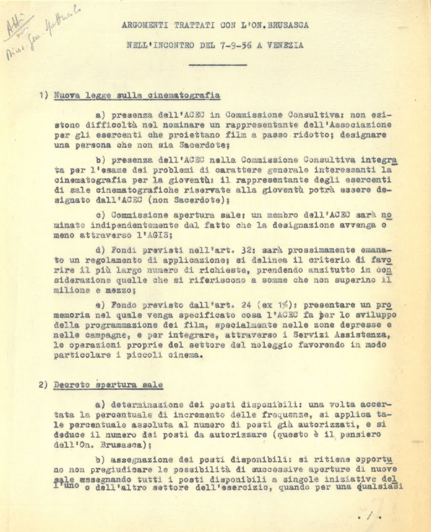 "Argomenti trattati con l'on. Brusasca nell'incontro del 7-9-56 a Venezia"