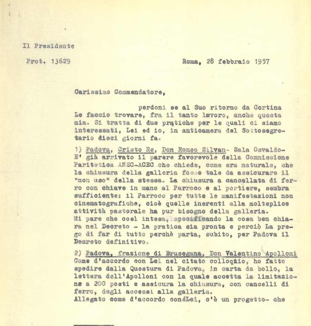 Mons. Francesco Dalla Zuanna scrive a Giovanni De Tomasi in merito a due pratiche in sospeso riguardanti la gestione di sale parrocchiali in provincia di Padova. Dattiloscritto