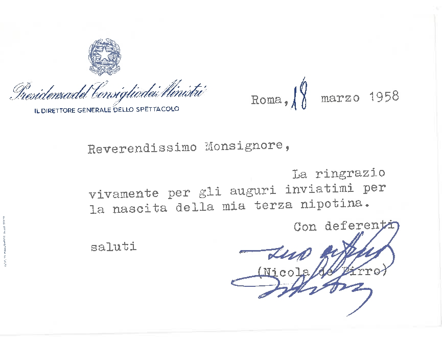 Lettera dell'avv. Nicola De Pirro, direttore generale dello spettacolo, a mons. Francesco Dalla Zuanna, presidente dell'ACEC