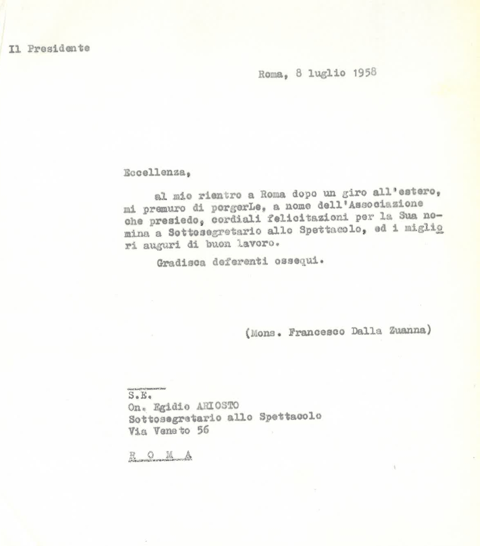 Lettera di mons. Francesco Dalla Zuanna, presidente dell'ACEC, all'on. Egidio Ariosto, sottosegretario allo spettacolo