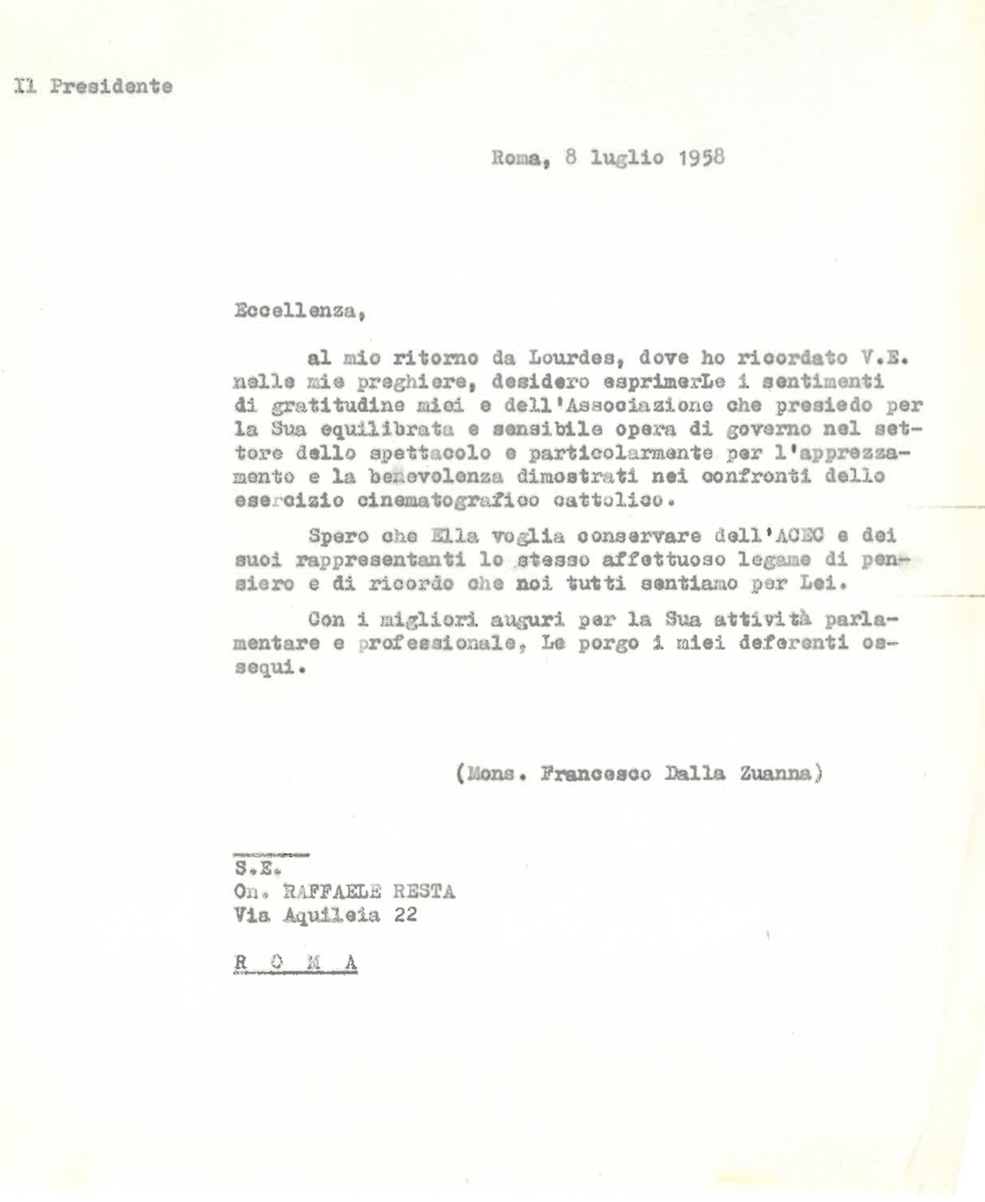 Mons. Francesco Dalla Zuanna invia all'on. Raffaele Resta i suoi ringraziamenti per l'opera di governo svolta nel settore dello spettacolo. Dattiloscritto