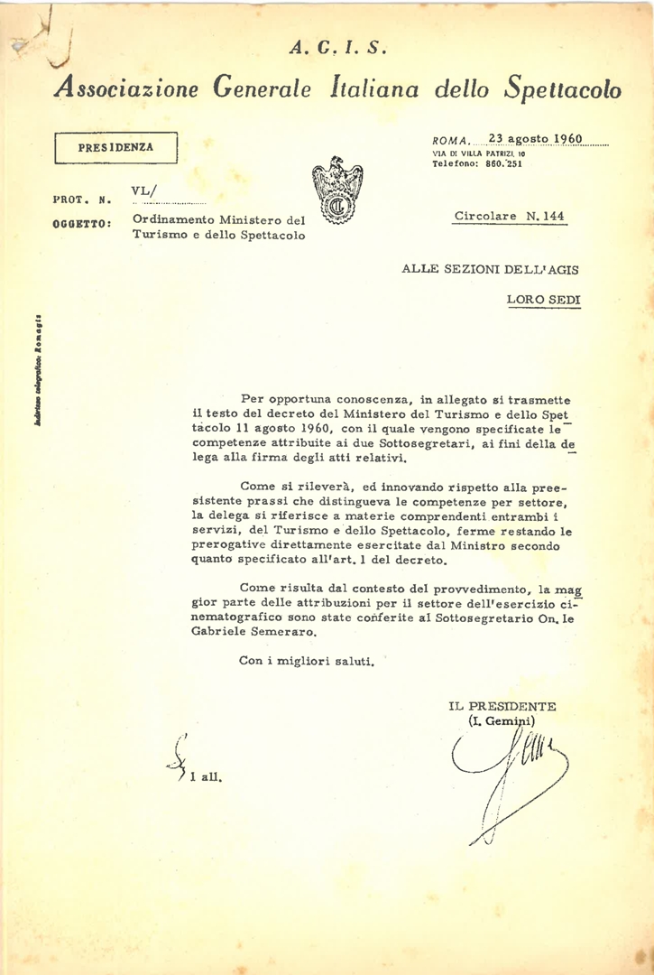 Con lettera di trasmissione di Italo Gemini, presidente dell'Associazione generale italiana dello spettacolo - AGIS, alle sezioni dell'AGIS. Dattiloscritto