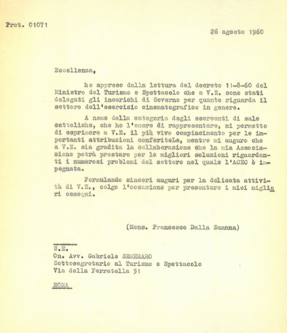 Mons. Francesco Dalla Zuanna si congratula con l'on. Gabriele Semeraro per le attribuzioni conferitegli nel settore dell'esercizio cinematografico. Dattiloscritto