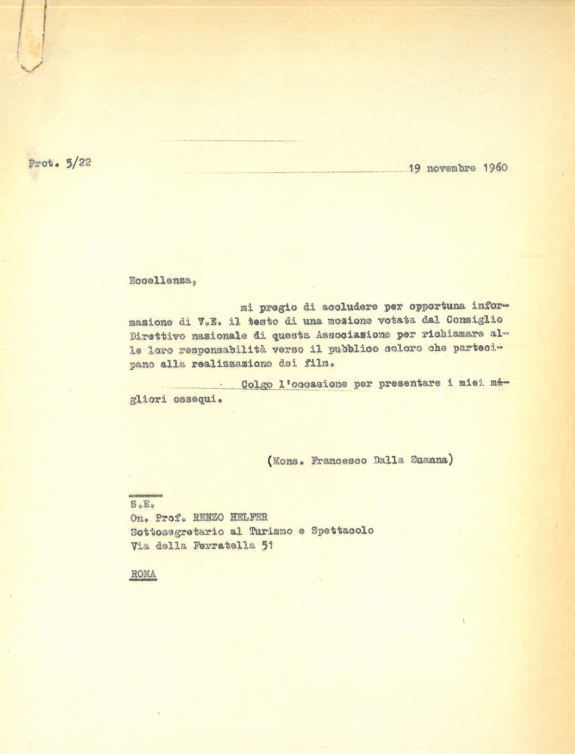 Con lettera di trasmissione di mons. Francesco Dalla Zuanna, presidente dell'ACEC, all'on Renzo Helfer, sottosegretario al turismo e spettacolo. Dattiloscritto