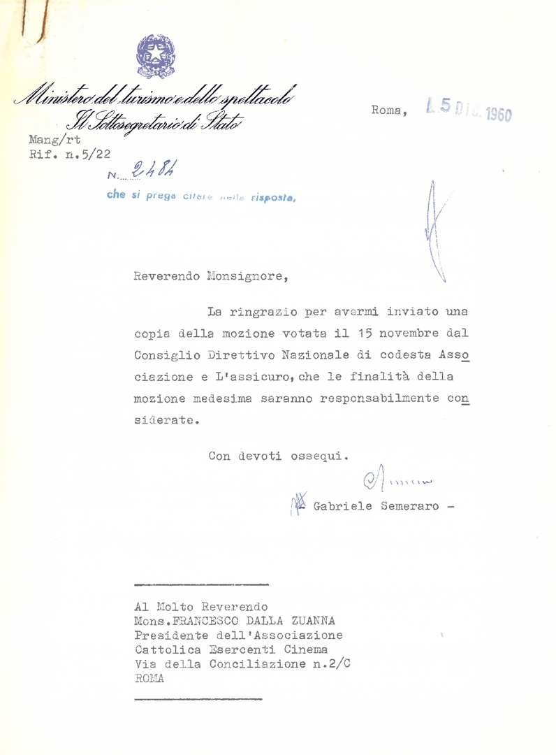 Lettera dell'on. Gabriele Semeraro, sottosegretario al turismo e allo spettacolo, a mons. Francesco Dalla Zuanna, presidente dell'ACEC